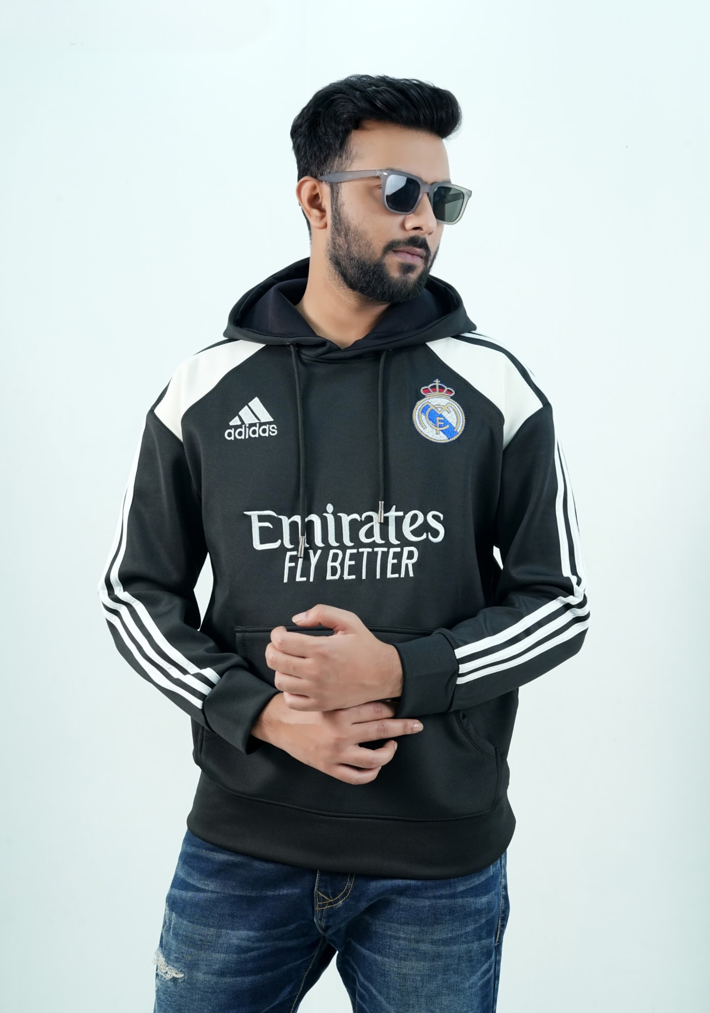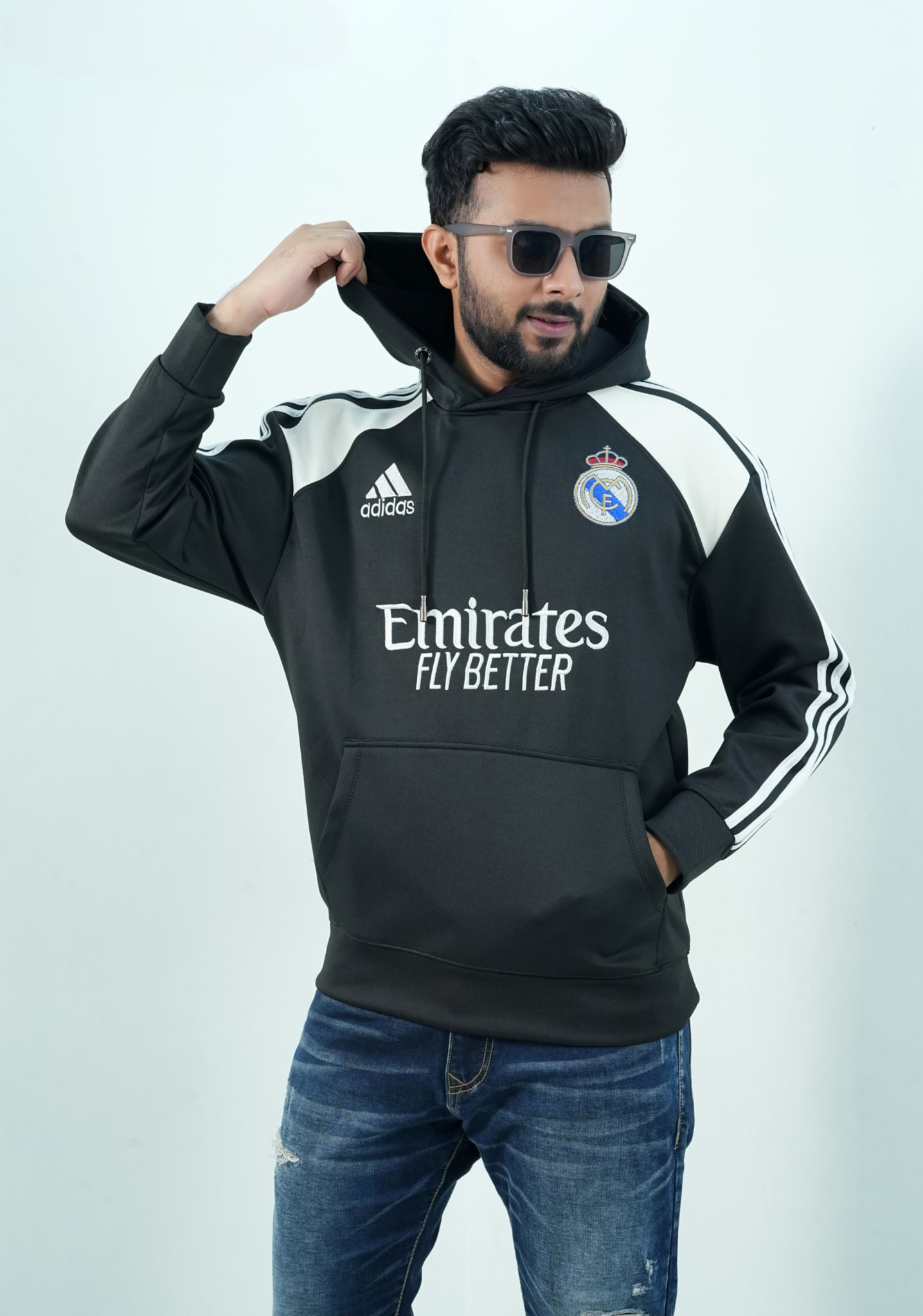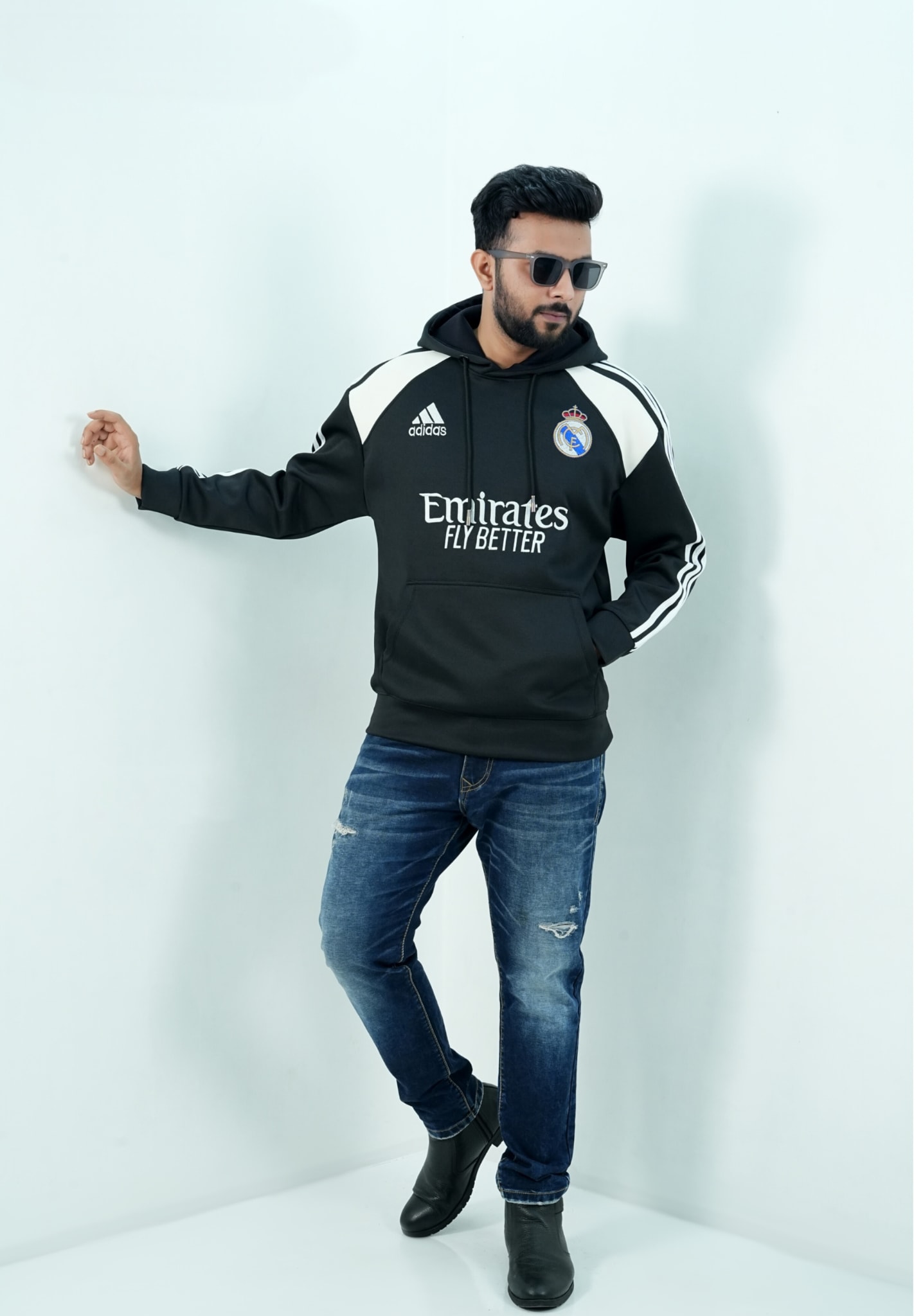 REAL MADRID HOODIE – More than a club, it’s an emotion. Crafted from high GSM China-imported Sprint fabric with export-grade stitching for unmatched warmth, comfort, and durability. A special edition hoodie that celebrates passion and pride.